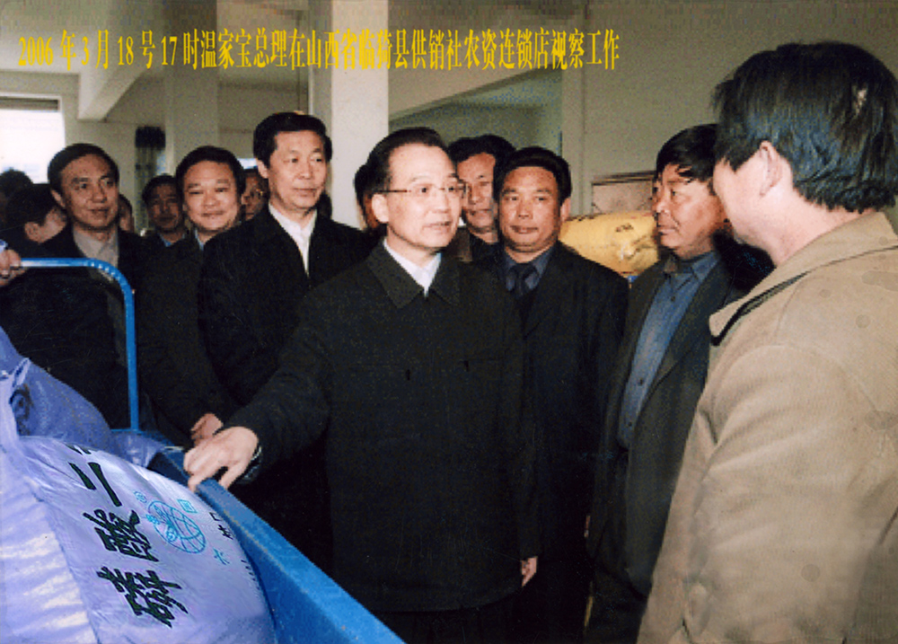 2006年3月18日,中共中面政治局常委、國務院總理溫家寶在安徽省委書記(時任山西省委書記)張寶順(左二)等陪同下,前往山西省臨猗縣z6mg人生就是博化肥經銷點視察工作。